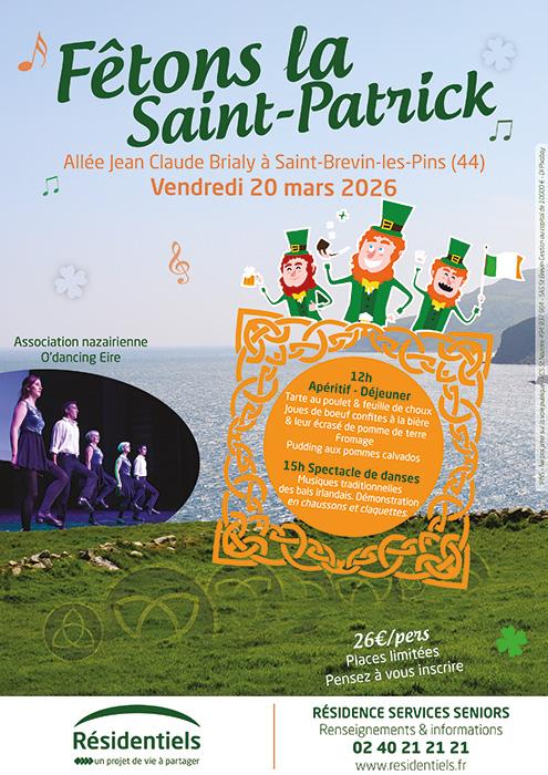 Fêtons la Saint-Patrick Vendredi 20 mars, nous vous proposons un déjeuner aux saveurs irlandaises, suivi d'un spectacle de danses traditionnelles. Un moment convivial pour partager un bon repas, écouter de la musique et profiter d'un bel après-midi ensemble. 26 € par personne Places limitées - pensez à vous inscrire.
