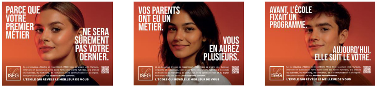 Dans un monde où le marché du travail se transforme à grande vitesse, l'ISEG choisit de regarder la réalité en face et de préparer les jeunes à un avenir pluriel, évolutif et créatif. Pensée pour questionner et faire réfléchir, la nouvelle campagne de l'ISEG qui renforce son positionnement, met en lumière une vérité fondamentale : la société change vite et les jeunes devront combiner plusieurs expertises afin de s'adapter à l'évolution permanente des métiers. Pour faire rayonner son positionnement et son approche éducative singulière, l'ISEG a déployé une campagne d'affichage nationale en DOOH dans les villes couvrant les 8 campus du groupe. Les affiches seront visibles jusqu'au 10 décembre..
